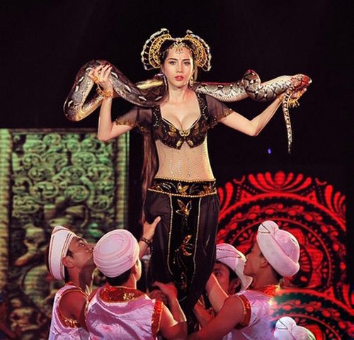 Nữ ca sĩ Thủy Tiên thậm chí còn vác cả trăn lên sân khấu khiến nhiều người hết hồn