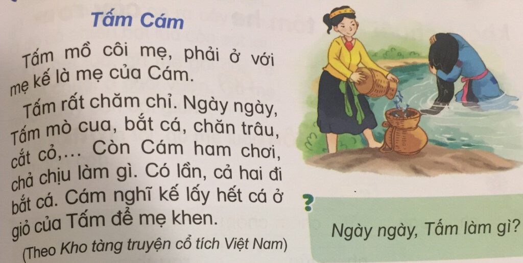 Tấm rất chăm chỉ. Ngày ngày, Tấm mò cua, bắt cá, chăn trâu, cắt cỏ,… Còn Cám ham chơi, chả chịu làm gì. Có lần, cả hai đi bắt cá. Cám nghĩ kế lấy hết cá ở giỏ của Tấm để mẹ khen”.