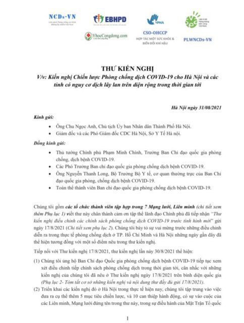 Ngày 31/8/2021, các tổ chức thành viên trong 7 Mạng lưới, Liên minh gửi “Thư kiến nghị Chiến lược Phòng chống dịch COVID-19” tới lãnh đạo thành phố Hà Nội và Trung ương nhằm “mục tiêu cao nhất là thành công cho Hà Nội khi vận dụng thực tế chỉ đạo mới nhất của Thủ tướng, cùng cung cấp thêm những bài học thành công vận dụng cho các tỉnh tiếp theo”. Kiến nghị nêu 5 mục tiêu chiến lược với 10 can thiệp hành động cụ thể.
