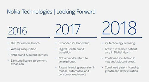 Cụ thể, năm 2017 Nokia sẽ mở rộng các đối tác thực tế ảo (VR), tăng thêm các bằng sáng chế về di động, công nghệ tự động, điện tử tiêu dùng và thiết bị chăm sóc sức khoẻ. Cùng với đó là kế hoạch trở lại sân chơi di động với loạt smartphone mới.