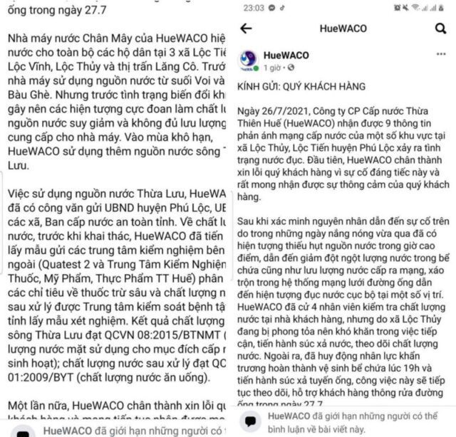 Ở một diễn biến có liên quan, vào tối 26/7, trên trang Fanpage Huewaco của công ty này có đăng tải dòng trạng thái với nội dung như sau: Ngày 26/7/2021, công ty Cổ phần cấp nước Thừa Thiên Huế nhận được 9 thông tin phản ánh mạng cấp nước của một số khu vực tại xã Lộc Thủy, Lộc Tiến, huyện Phú Lộc xảy ra tình trạng nước đục. Đầu tiên, Huewaco chân thành xin lỗi quý khách hàng vì sự cố đáng tiếc này và rất mong nhận được sự thông cảm của quý khách hàng.