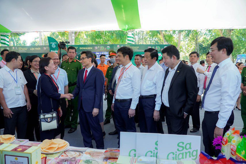 Phó Thủ tướng Vũ Đức Đam và các đại biểu tham quan Triển lãm các sản phẩm thế mạnh trong nông nghiệp vùng ĐBSCL.
