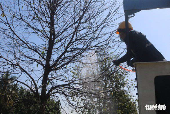 Sáng 7/9, Xí nghiệp cây xanh 1 thuộc Công ty TNHH một thành viên Công viên cây xanh TP.HCM phun thuốc sinh học 48 cây xanh trên đường Phạm Văn Đồng để phòng ngừa và ngăn chặn sâu ăn lá tấn công.