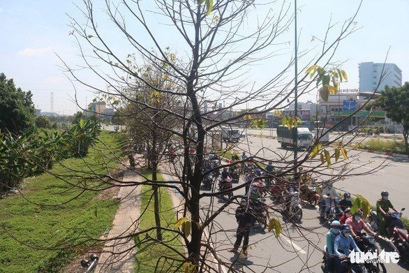 Như Tuổi Trẻ Online đã thông tin trước đó dọc theo đường Phạm Văn Đồng, nhiều cây xanh bị sâu dài hơn 5cm “tấn công”, ăn trụi hết lá.