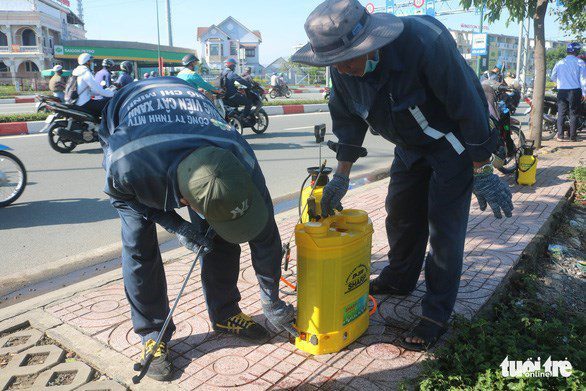 Sáng 7/9, Xí nghiệp cây xanh 1 thuộc Công ty TNHH một thành viên Công viên cây xanh TP.HCM phun thuốc sinh học 48 cây xanh trên đường Phạm Văn Đồng để phòng ngừa và ngăn chặn sâu ăn lá tấn công.