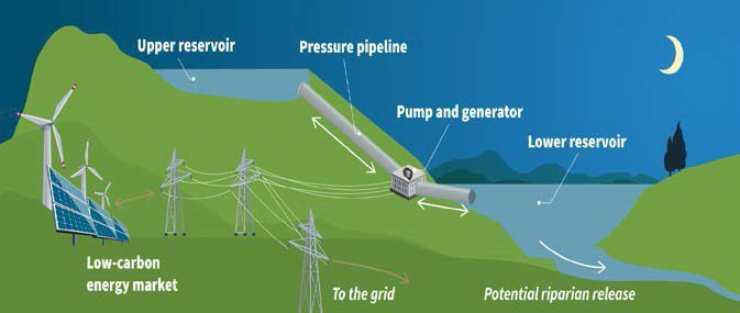 Để lưu trữ điện cho những nhà máy ĐMT công suất lớn, người ta đã đưa ra nhiều giải pháp khác nhau. Giải pháp hữu hiệu đầu tiên là “Thủy điện tích năng”, tức là dùng năng lượng ĐMT lúc dư thừa để bơm nước lên những bể chứa lớn ở một độ cao nhất định rồi cho dòng nước chảy xuống một hồ chứa ở vị trí thấp hơn qua một đường ống, làm quay tua bin phát điện vào những giờ cao điểm (Hình 1). Phương pháp này hiện chiếm khoảng 90% điện năng lưu trữ trên toàn thế giới được áp dụng khá rộng rãi tại Hoa Kỳ, Trung Quốc và Nhật Bản… Ở Việt Nam, chúng ta đã khởi công xây dựng nhà máy thủy điện tích năng ở Bắc Ái, Ninh Thuận (Hình 2) công suất 4 x 300 MW với vốn đầu tư 21.000 tỷ đồng và dự kiến vận hành vào năm 2029.