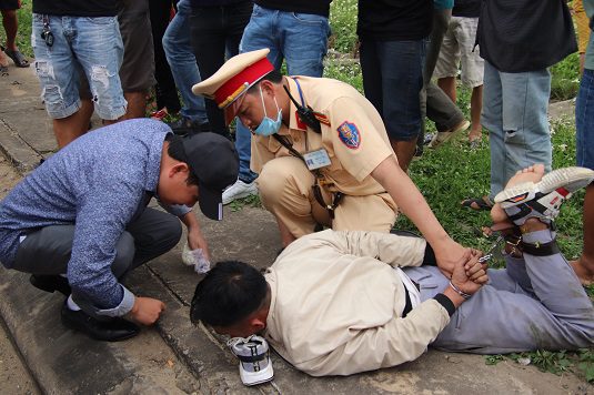 Sau khi xe vừa ngừng lăn bánh thì một đối tượng nam đang ngồi trên ô tô nhảy xuống bỏ chạy qua cánh đồng, còn đối tượng thứ hai liền bị lực lượng CSGT khống chế khoá tay vào còng số 8.