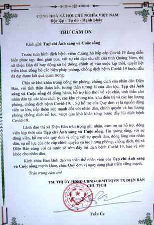 Chia sẻ khó khăn trong công tác phòng, chống dịch của nhân dân huyện Điện Bàn (Quảng Nam), với tinh thần đoàn kết, tương thân tương ái của dân tộc, TC Ánh Sáng & Cuộc sống đã đồng hành, hỗ trợ kịp thời về vật chất, tinh thần cho nhân dân tại các khu cách ly, các khu phong tỏa, khu điều trị và các lực lượng phòng, chống dịch bệnh Covid-19. Thay mặt lãnh đạo UBND TX. Điện Bàn, ông Lê Thanh Long-CVP trân trọng ghi nhận, cám ơn sự hỗ trợ, động viên kịp thời của TC ÁS&CS.