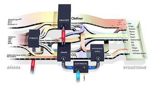 Điều làm cho nó khả thi khi sử dụng nhựa được thu thập và phân loại trong các nhà máy hóa dầu quy mô lớn là một khối lượng vật liệu được thu thập đủ, có nghĩa là về mặt lý thuyết các nhà máy có thể duy trì cùng một sản lượng. Những nhà máy này cần khoảng 1-2 triệu tấn chất thải nhựa được phân loại mỗi năm để chuyển đổi cho phù hợp với mức sản xuất mà họ hiện đang nhận được từ dầu và khí hóa thạch. Tổng lượng chất thải nhựa của Thụy Điển trong năm 2017 là khoảng 1,6 triệu tấn. Chỉ có khoảng 8% trong số đó được tái chế thành nhựa có chất lượng thấp hơn.