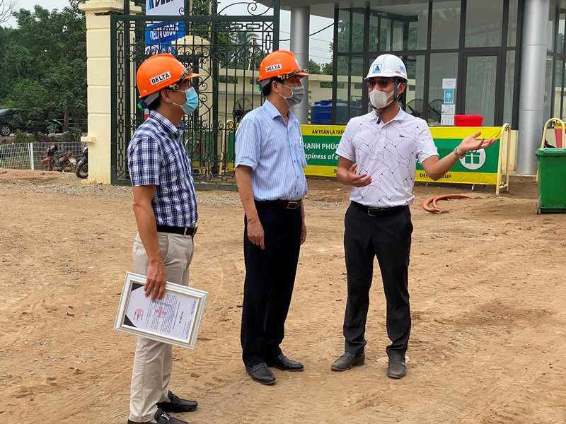 Ông Trần Trung Tưởng – Phó Tổng Giám đốc Công ty CP Bóng đèn Phích nước Rạng Đông (đứng giữa) trao đổi với ông Hoàng Ngọc Tú – PTGĐ Công ty TTHH Tập đoàn xây dựng Delta (bên phải) là đơn vị Tổng thầu xây dựng của Dự án.