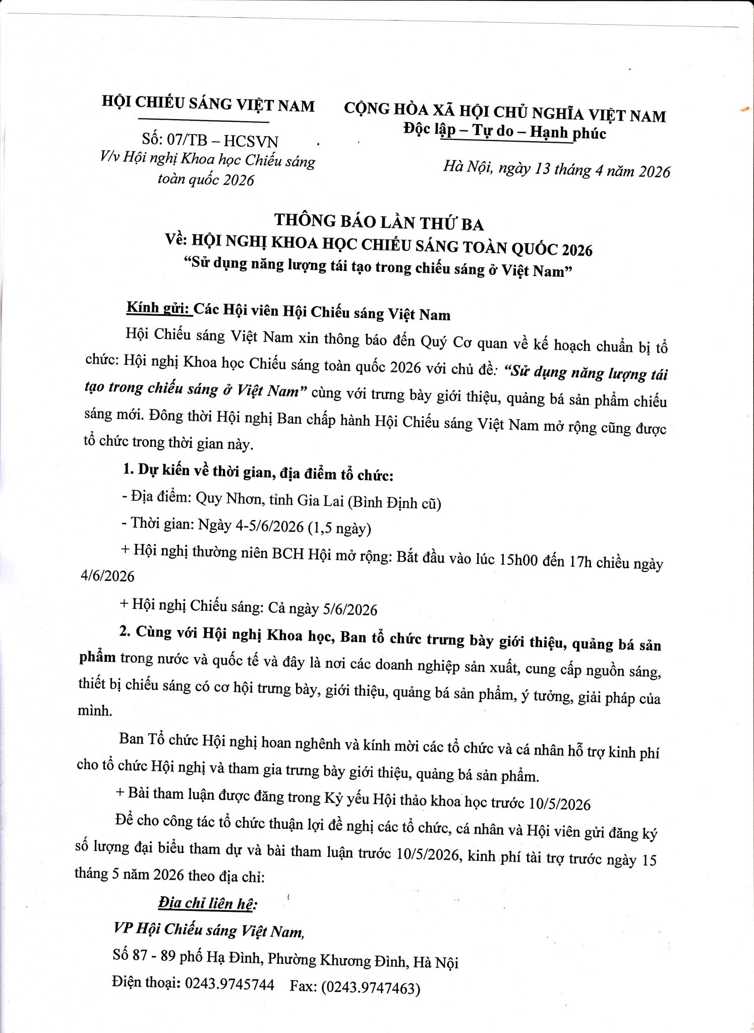 Hội chiếu sáng Việt Nam vừa ra thông báo số 07/TB-HCSVN về Hội nghị Khoa học chiếu sáng toàn quốc 2026. Địa điểm dự kiến sẽ diễn ra tại Quy Nhơn, tỉnh Gia Lai (Bình Định cũ). Thời gian bắt đầu từ ngày 4-5/6/2026.