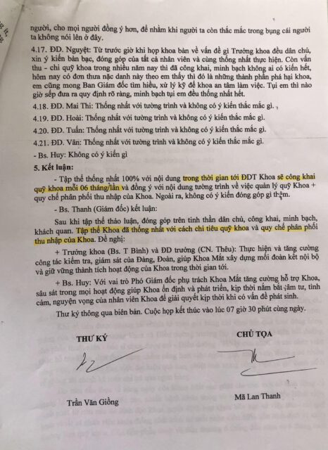 Về việc Khoa Mắt lập quỹ riêng từ năm 2013, mỗi năm khoảng 500 triệu đồng đã được xác nhận là có. Việc lập quỹ được giải thích là lập trên cơ sở tự nguyện đóng góp từ thu nhập của các cá nhân trong khoa, để phục vụ hoạt động nội khoa; quỹ đã ngưng từ cuối năm 2020. Tuy nhiên vấn đề thu, chi của quỹ không minh bạch chưa được làm rõ. Mặt khác, theo Biên bản họp Khoa Mắt ngày 29/3/2021 do Giám đốc Bệnh viện Mã Lan Thanh chủ trì, cho phép tiếp tục lập quỹ với kết luận “Trong thời gian tới Điều dưỡng trưởng khoa sẽ công khai quỹ khoa 6 tháng/lần”. Như vậy có phải thực tế quỹ vẫn hoạt động mà không hề ngừng từ cuối năm 2020 như giải thích?.