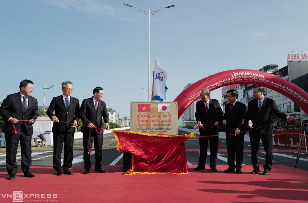 Lãnh đạo Chính phủ, UBND TP Hà Nội và Bộ Giao thông Vận tải làm lễ khánh thành, gắn biển công trình đường Vành đai 3 trên cao có biểu tượng quốc kỳ Việt Nam – Nhật Bản.