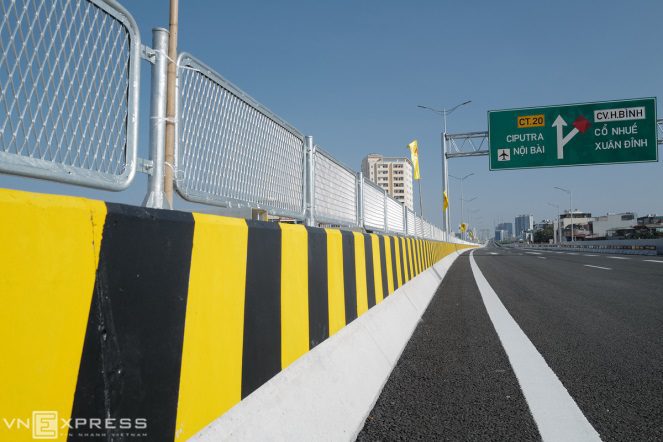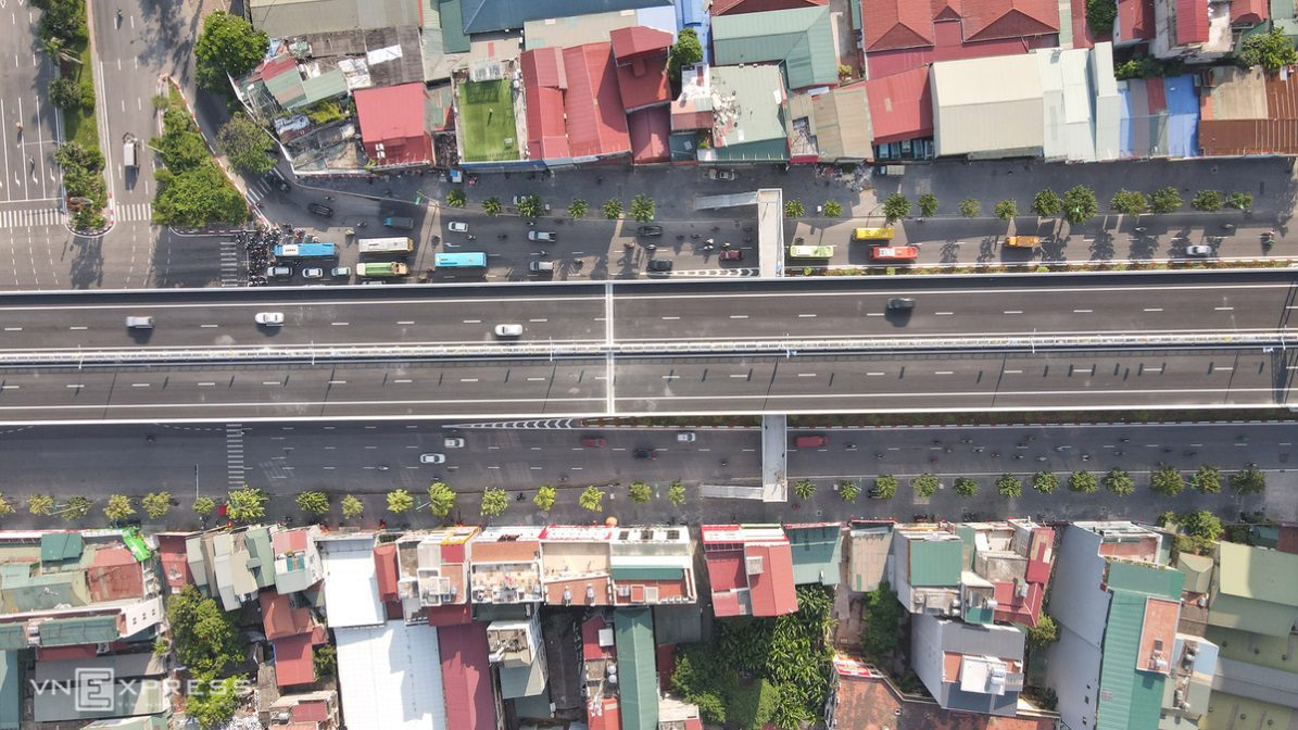 Bên dưới cầu là đường Phạm Văn Đồng được mở rộng mỗi bên 6 làn xe, với cảnh quan xanh cho cửa ngõ thủ đô. Đường này đã được thông xe hơn một năm trước.