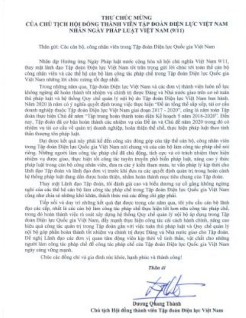 Thư chúc mừng của Chủ tịch Hội đồng thành viên Tập đoàn Điện lực Việt Nam nhân ngày Pháp luật Việt Nam 09/11 gửi đến các Tổng công ty, Công ty-doanh nghiệp đang hoạt động trong lĩnh vực ngành điện.