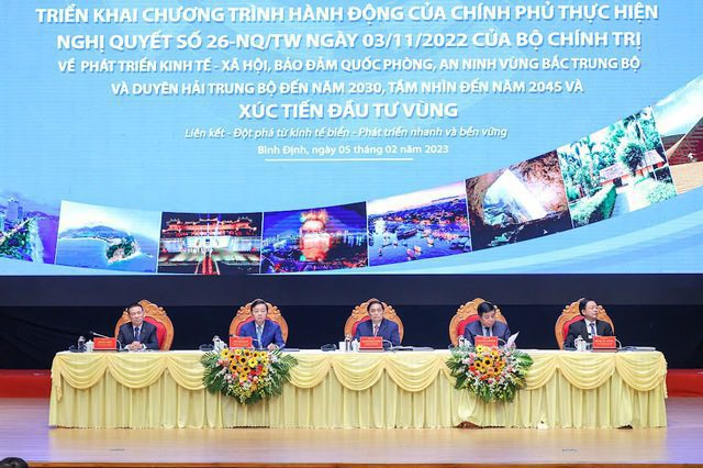 Sáng 5/2, tại thành phố Quy Nhơn, tỉnh Bình Định, Thủ tướng Phạm Minh Chính chủ trì Hội nghị triển khai Chương trình hành động của Chính phủ thực hiện Nghị quyết số 26-NQ/TW ngày 03/11/2022 của Bộ Chính trị về phương hướng phát triển kinh tế – xã hội và bảo đảm quốc phòng, an ninh Vùng Bắc Trung Bộ và Duyên hải Trung Bộ đến năm 2030, tầm nhìn đến năm 2045 và xúc tiến đầu tư vùng.
