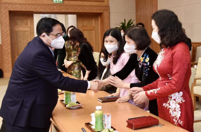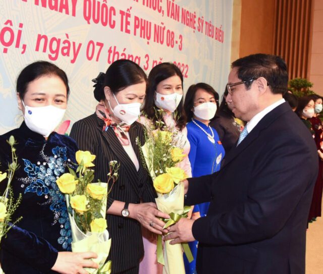 Mặt khác, Thủ tướng bày tỏ, chúng ta suy nghĩ và hành động như thế nào để giúp đỡ nhiều chị em vượt qua những rào cản về văn hóa, định kiến về giới, có điều kiện, cơ hội vươn lên xây dựng cuộc sống ấm no, bình đẳng, hạnh phúc. Trước mắt, cùng tập trung thực hiện “Thích ứng an toàn, linh hoạt, kiểm soát hiệu quả dịch bệnh COVID-19” tạo nền tảng quan trọng phục hồi nhanh, phát triển kinh tế – xã hội bền vững; điều này đòi hỏi sự quyết tâm cao của cả hệ thống chính trị, phát huy sức mạnh đại đoàn kết toàn dân tộc, trong đó có vai trò quan trọng, không thể tách rời của chị em phụ nữ, nhất là đội ngũ cán bộ nữ lãnh đạo, quản lý các cấp và nữ trí thức, văn nghệ sỹ.