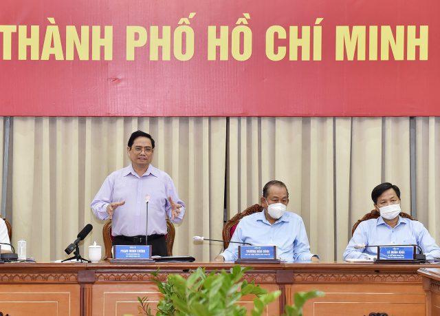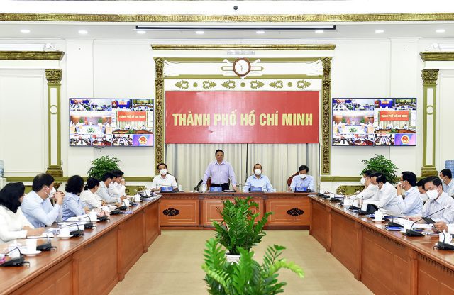 Chiều 26/6, tại TP Hồ Chí Minh, Thủ tướng Phạm Minh Chính đã chủ trì cuộc họp trực tuyến với TP Hồ Chí Minh và 7 địa phương lân cận thuộc vùng kinh tế trọng điểm phía Nam: Bình Dương, Đồng Nai, Bà Rịa – Vũng Tàu, Bình Phước, Tây Ninh, Long An, Tiền Giang để động viên, kiểm tra, đôn đốc công tác phòng chống dịch bệnh, bàn và đưa ra các giải pháp nhằm ngăn chặn, đẩy lùi dịch bệnh, phát triển kinh tế, đảm bảo đời sống vật chất và tinh thần cho nhân dân.