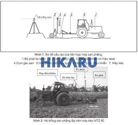 Liên hợp máy (Hình 1 và 2) gồm có máy kéo (7) liên kết móc với cụm gàu san (4). Bộ phận nhận tín hiệu laser (3) được lắp cố định trên cụm gàu san (4) và cao hơn nóc máy kéo để không bị máy kéo cản tín hiệu trong suốt thời gian hoạt động. Trên bộ phận (3) có gắn các cảm biến xác định vị trí tương đối của mặt phẳng laser do máy phát (1) tạo ra so với vạch 0 của bộ phận nhận tín hiệu. Hộp phân phối thuỷ lực (5) được nối với hệ thống thuỷ lực của máy kéo và xi lanh thuỷ lực (2). Cụm gàu san (4) được nâng lên, hạ xuống bởi xilanh (2).