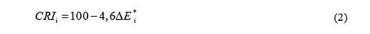 với ΔEi* là độ lêch màu của mẫu chuẩn thứ i được chiếu bằng nguồn sáng chuẩn và sau đó bằng nguồn thử (nguồn cần xác định CRI). Theo (2), ánh sáng mặt trời hay đèn sợi đốt tiêu chuẩn không có sự khác biệt về màu sắc so với các mẫu chuẩn nên ΔEi*= 0 và CRIi = 100.