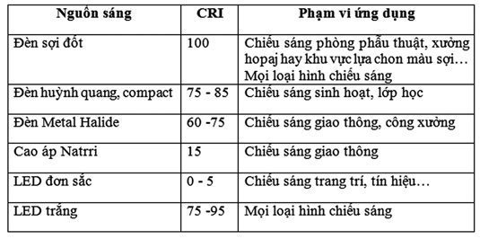 Bảng1 cho ta biết chỉ số hoàn màu và phạm vi sử dụng của một số nguồn sáng thông dụng.