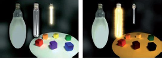Hình 1 phản ánh sự thể hiện màu của đèn Metal halide (CRI =75) và đèn Sodium áp suất thấp (CRI = 5) khi cùng chiếu sáng cho một đối tượng. Nhìn hai hình, ta thấy rằng màu của đối tượng được thể hiện đúng hơn trong trường hợp được chiếu sáng bằng đèn Metal halide. Quan sát kỹ hơn, ta thấy thậm chí miếng thủy tinh màu xanh lam trở thành tối đen khi được chiếu sáng bằng đèn Sodium áp suất thấp.