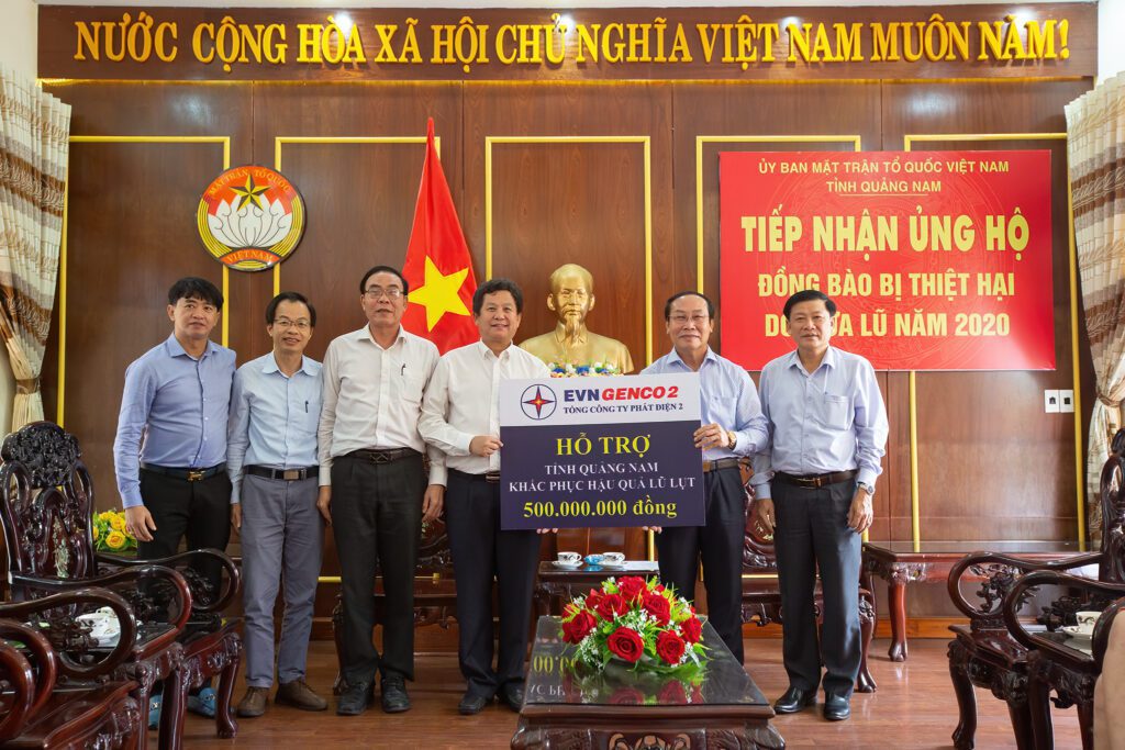 Chia sẻ những khó khăn và mất mát của các tỉnh miền Trung ruột thịt, sáng ngày 21 và 22/10/2020, đoàn của Tổng công ty Phát điện 2 (EVNGENCO 2) do ông Trương Hoàng Vũ – Tổng Giám đốc và ông Nguyễn Duy Lăng – Phó Tổng Giám đốc, Chủ tịch Công đoàn Tổng công ty dẫn đầu đã trực tiếp vào miền Trung hỗ trợ, thăm hỏi đồng bào vùng lũ lụt, đồng thời trao số tiền ủng hộ cho UBMTTQVN tỉnh Quảng Trị 500 triệu đồng và UBMTTQVN tỉnh Quảng Nam 500 triệu đồng.