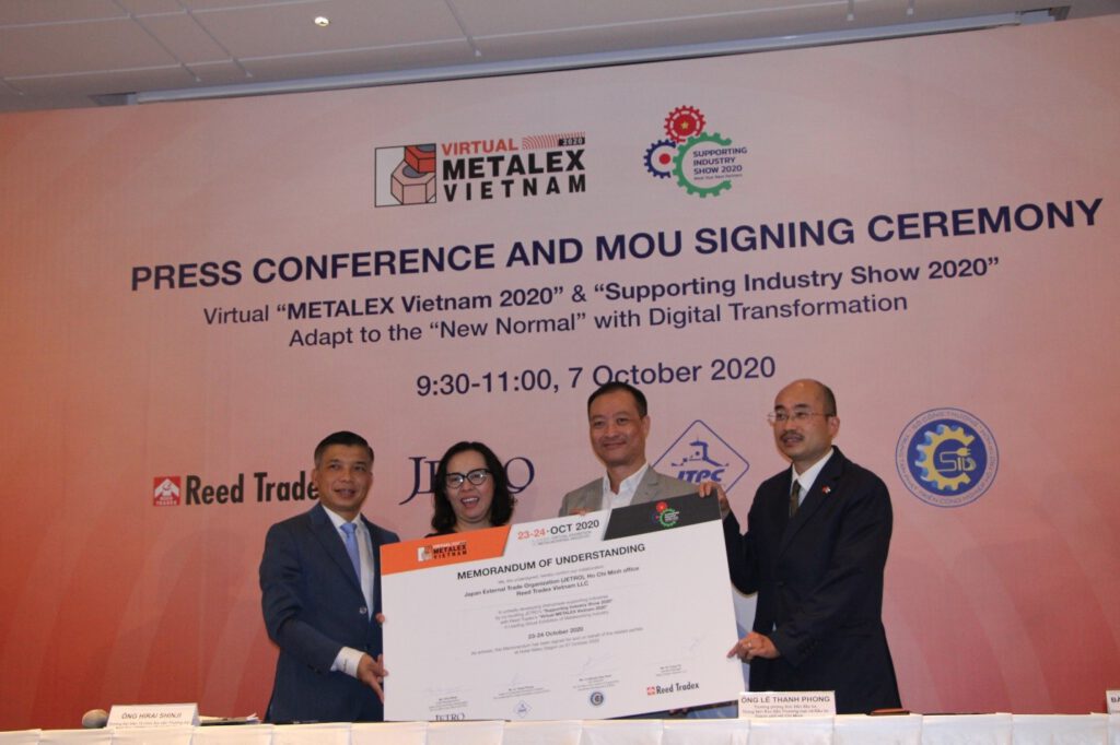 Chương trình họp báo và Lễ Ký kết hợp tác giữa Tổ chức Xúc tiến Thương mại Nhật Bản tại TP HCM, Trung tâm Xúc tiến Thương mại và Đầu tư TP HCM, Trung tâm Phát triển Công nghiệp Hỗ trợ TP HCM sẽ kết hợp cùng công ty Reed Tradex Vietnam tổ chức triển lãm Metalex Vietnam 2020 dưới hình thức trực tuyến.