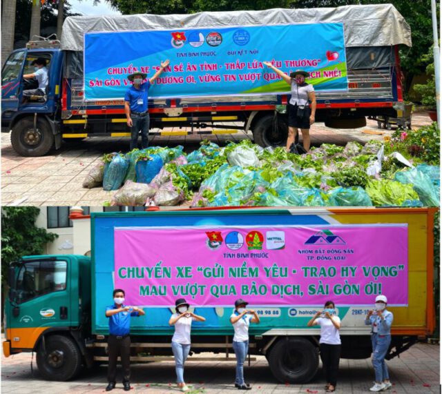 Trước đó 1 tuần, thông qua sự kết nối với Tỉnh Đoàn Bình Dương, Thành Đoàn Thủ Đức và Trung tâm Công tác xã hội thanh niên TP Hồ Chí Minh, chuyến xe thứ 5 mang tên “San sẻ ân tình – Thắp lửa yêu thương” của Tỉnh Đoàn Bình Phước đã đến cả Sài Gòn lẫn Bình Dương để gửi tặng hơn 10 tấn rau, củ, quả và các nhu yếu phẩm thiết yếu đến người dân trong vùng dịch.