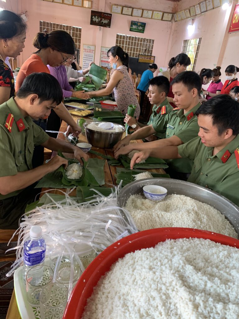 Gần 200 lượt người trong đó có các cán bộ, chiến sĩ công an tỉnh Bình Phước, Công an TP. Đồng Xoài cùng nhiều người dân tại khu phố Phú Thanh đã cùng nhiệt tình tham gia các khâu của công đoạn gói bánh. Từ người già đến trẻ con đều vô cùng hăm hở khi được góp phần thực hiện công việc ý nghĩa này.