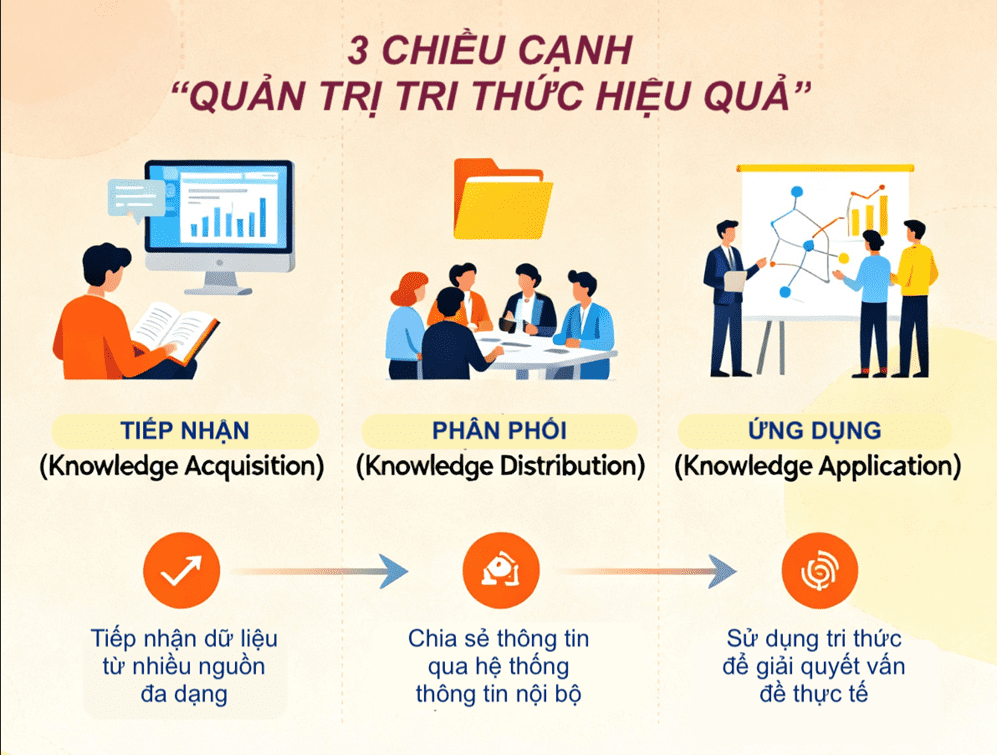 Trong bối cảnh cạnh tranh dựa trên tri thức và chuyển đổi số, quản trị tri thức là năng lực tổ chức cốt lõi giúp SME giảm phụ thuộc cá nhân, chuẩn hóa vận hành và nâng cao chất lượng, năng suất. Trọng tâm của quản trị tri thức là thu nhận, phân phối và ứng dụng tri thức vào quyết định và quy trình; đặc biệt, việc chuyển hóa tri thức ẩn thành tri thức hiển thị rút ngắn thời gian thích nghi của nhân sự và giảm tổn thất tri thức khi biến động lao động (Nonaka & Takeuchi, 1995). Quản trị tri thức đồng thời là nền móng cho Quản lý chất lượng toàn diện (TQM): khi gắn với chiến lược, nhân sự và quy trình, hiệu quả tiếp nhận, chia sẻ, áp dụng tri thức được khuếch đại rõ rệt (Ooi, 2014). Về thiết kế quản trị, nguyên tắc ưu tiên là “luồng tri thức trước – công nghệ sau”: xác lập mục tiêu, vai trò và quy trình quản trị tri thức theo khung MBNQA (lãnh đạo, chiến lược, khách hàng, thông tin & phân tích, nhân sự, quy trình) rồi lựa chọn công nghệ gọn nhẹ để hỗ trợ thực thi. Quy trình này được khẳng định là rất phù hợp với các SME tại các Quốc gia đang phát triển trong đó có Việt Nam.