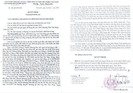 Quyết định số 15/QĐ-VKS-KN ngày 03/7/2019 do Viện trưởng VKSND huyện Phú Quốc- Nguyễn Hoàng Hà ký “giải quyết khiếu nại” của anh Trần Văn Sáng. Quyết định lược lại quá trình Công ty M.E của ông Erhard Werner Kuster (quốc tịch Đức) thuê Công ty Bảo Quân của ông Bùi Quang Công xây mấy căn nhà trên mảnh đất ở xã Dương Tơ (Phú Quốc, Kiên Giang). Sau đó, Công ty M.E bán nhà đất cho ông Bùi Văn Thảo và ông Thảo cho anh Trần Văn Sáng thuê kinh doanh. Ngày 08/4/2019, ông Bùi Quang Công và Bùi Minh Tuấn đưa nhiều người đến khiêng đồ đạc của anh Sáng ra ngoài, giành giữ nhà, từ đó gia đình anh Sáng phải che lều ở tạm trên vỉa hè.