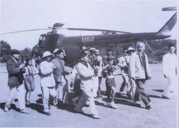Khoảng 9 giờ sáng hôm đó, một chiếc trực thăng bay đến, hạ cánh xuống sân vận động ở phía Đông. Bác Hồ từ máy bay bước ra với bộ quần áo kaki giản dị đã bạc màu năm tháng. Bác đội mũ trắng vành tròn, chân mang tất trắng trong đôi dép cao su vừa đi vừa vẩy cánh tay phải chào đồng bào, khuôn mặt nở nụ cười tươi rạng rỡ. Sau khi đón nhận những bó hoa tươi thắm từ các cháu thiếu nhi kính tặng, Bác quay sang hỏi đồng chí Mạnh: Chú là Quản đốc Nông trường à? Đồng chí Mạnh trả lời: Dạ, cháu là Giám đốc ạ. Bác liền chữa lại: Quản đốc chứ! Chú Mạnh cảm thấy trong lòng mình hơi ngượng nghịu.
