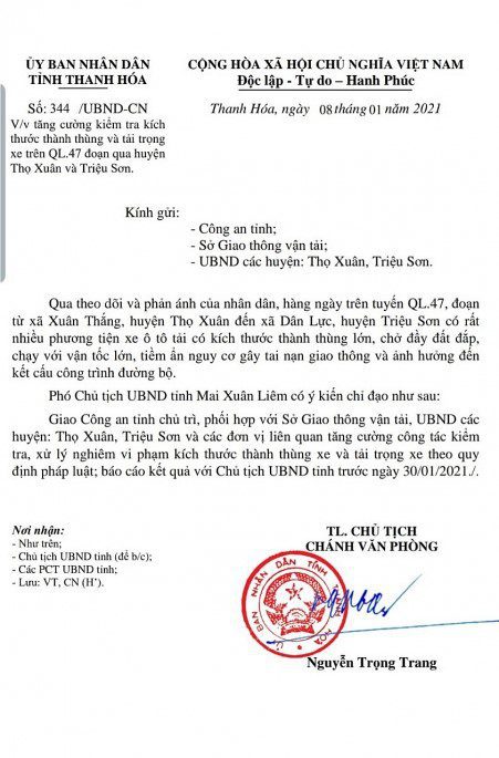 Phó Chủ tịch UBND tỉnh Mai Xuân Liêm đã giao Công an tỉnh chủ trì, phối hợp với Sở Giao thông vận tải, UBND các huyện Thọ Xuân, Triệu Sơn và các đơn vị liên quan tăng cường công tác kiểm tra, xử lý nghiêm vi phạm kích thước thành thùng xe và tải trọng xe theo quy định pháp luật; báo cáo với Chủ tịch UBND tỉnh trước ngày 30-1-2021.